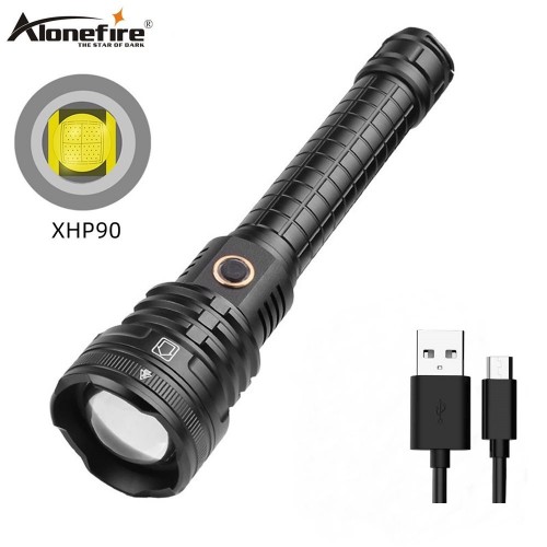 Others bought: Feature: 1. Brand Name: AloneFire 2. Model Name: H49 3. LED: XHP90 LED 4. 5-Modes: High / Middle/ Low / Strobe / SOS 5. Flashlight Color: Black 6. Switch: Middle button switch 7. Material: Aluminum alloy 8. Dimensions: 260mm(length)x 60mm(head) x 35mm(Tail) 9. Weight(g): About 432g 10. Lighting Distance: About 200-500 meters 11. Battery: For 2 x 18650 / 2 x 26650 battery 12.Function: Micro USB Rechargeable / Output:5V=1A 13. Can live waterproof (can be used in rainy days), but can not dive, can not be soaked in water