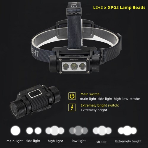 Specification Brand Name: Alonefire Product name: HP52 New Model Multi-functional Mini Headlamp Shell material: Aviation grade aluminum body, wear-resistant hard anodizing LED Type: 1 x XM-L2 + 2 x XP-G2 Brightness: 6000 lumen Color Temperature: 6000K Work Mode: Extremely bright switch: three lights - off Main switch: Mid bright - side light - three lights - three lights low - three lights strobe - Off Battery Type: For 1 x 21700 / 18650 battery or 3 x AAA Battery Charge mode: USB Type-C Cable Switch: Button Switch Lighting distance: 200 Meter Waterproof: IPX4 Weight: 303g