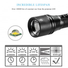 Others bought: Feature: About flashlight: 1. Brand Name: AloneFire 2. Model Name: X007 3. LED: XML-T6 LED 4. 5 -Modes: High>Middle>Low>Strobe>SOS 5. Lamp Life:100,000 Hours 6. Flashlight Color:Black 7. Emitted Color:White Light 8. Switch: Push Switch 9. Case material:Durable aircraft-grade aluminum 10. Dimensions: 131/137mm(length) x 25.4mm(diameter) x 36mm(head) 11. Weight(g):About 148g 12. Battery: For 1 x 18650 battery 13. Lighting Distance:Above 200 meters 14. LED Life:More than 100000 hours 15. Can live waterproof (can be used in rainy days), but can not dive, can not be soaked in water