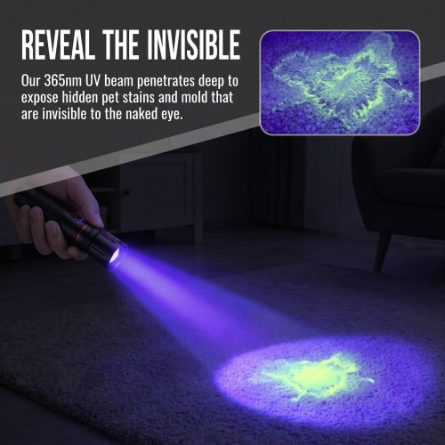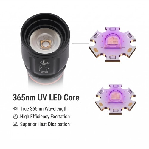 The 365nm flashlight emits invisible light. When it illuminates a substance lacking fluorescent agents, the true original color of the object becomes visible. Conversely, stains become conspicuous.