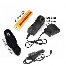 Accessories including: 1 x flashlight 1 X Flashlight Holster 1 x 18650 4200mAh Battery 1 x Charger 1 x Car charger 1 x Green Plastic box