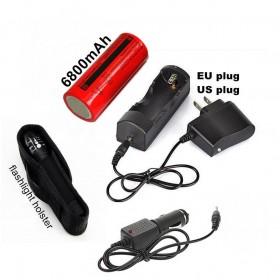 Accessories including: 1 x flashlight 1 x 18650 casing 1 x AAA battery holder 1 X Flashlight Holster 1 x 26650 6800mAh Battery 1 x Charger 1 x Car charger 1 x Green Plastic box